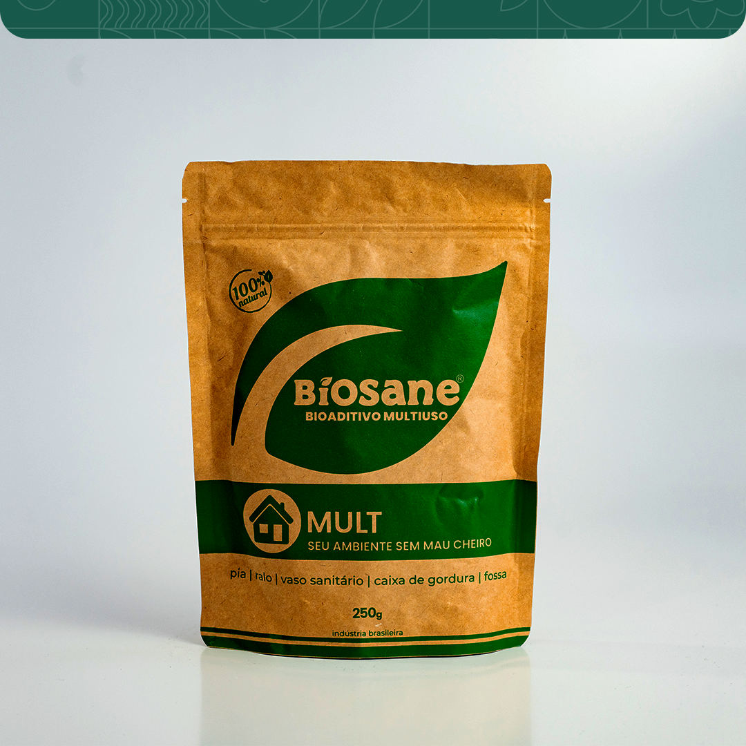 Bíosane Mult (250g). Tratamento biológico 100% natural, que degrada a matéria orgânica acumulada nos ralos, tubulações, caixas de gordura, fossas sépticas, sumidouros, filtros biológicos, compostagens, ambientes Pet, banheiros de embarcações e ETEs. Evita mau cheiro.